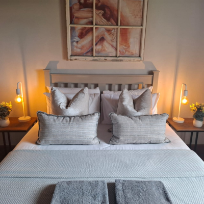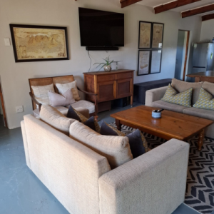 The entire farmhouse with all the modern-day amenities is at your disposal. You get to relax at the pool, have fun in the braai “kuier” room, or just relax outdoors on the luscious lawn. Your furry friends have space to stretch their legs. The farm is ideal for enjoying the fresh air, walks/exploring nature, and mountain biking trails. Fully equipped kitchen with utensils and cutlery.
